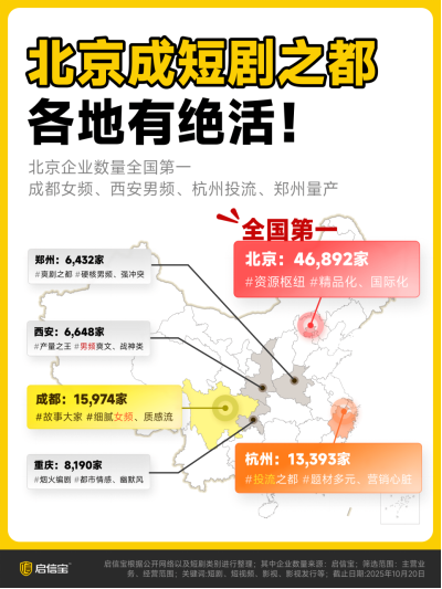 短剧的热潮也激活了地方经济,多个城市积极布局,开启了“竖店”争夺战。根据启信宝数据,2025年中国短剧相关企业数量排名前十的城市分别是:北京、上海、成都、广州、杭州、深圳、重庆、郑州、武汉和西安。北京以4.68万家的体量断层领先,规模是第二名上海(1.96万家)的两倍以上。从增长动能来看,成都、广州、杭州、重庆、武汉五城增速较快,高于全国水平。