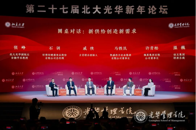圆桌对话环节以“新供给创造新需求”为主题,由光华管理学院副院长张峥主持,凯盛浩丰农业集团有限公司董事长马铁民、古茗联合创始人戚侠、佩莱集团有限公司(以下简称“佩莱”)董事长许青松、依文集团联席总裁温巍、好想你健康食品股份有限公司总经理石训五位企业代表围绕消费市场核心议题展开深度探讨,共同剖析中国消费市场的现状与未来。