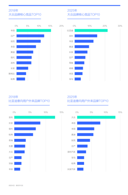在小电动未强势崛起之前,海外品牌几乎不带中国品牌玩,两大阵营各玩各的。2018年大众的最大竞品为丰田,其次是日产、别克、本田和奥迪,TOP5全为海外品牌。中国品牌很难向海外品牌渗透,2018年比亚迪的意向用户外来品牌最多的是吉利,其次是长安,第三虽是现代,但第四、第五和第六分别为哈弗、奇瑞和五菱,都是中国品牌。2020年起,随着中国品牌小电动的强势崛起,海外品牌的传统竞争格局遭遇重创,中国品牌的威胁越来越大。2025年大众的最大竞品为比亚迪,其次是吉利、丰田、奥迪和长安,中国品牌占了大众竞品TOP5的三席,意味着大众的任何市场举措,首先就得考虑能否拿捏中国品牌。中国品牌不仅成为海外品牌的强劲对手,而且正大肆抢夺海外品牌的老用户,尤其是“他”。2025年比亚迪的意向用户外来品牌用户最多的就是大众,其次是本田、丰田、奥迪与别克,TOP5全是保有量巨大的海外品牌。这些用户可不是全冲着比亚迪的小电动来的,还有汉、唐等更高端产品。上述演变间接说明比亚迪品牌的高端化迫在眉睫,在充分总结2025年夏与唐L成败得失的基础上,2026年大唐(最终车名尚未确定)、大汉(最终车名尚未确定)、海狮08等新一批高端产品不容闪失;