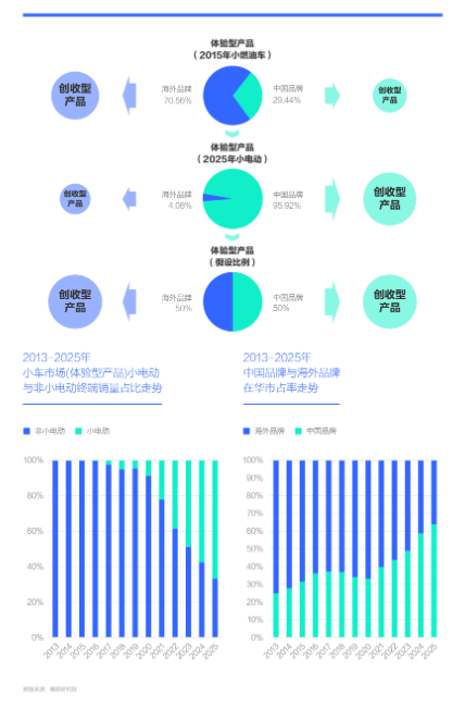 2025年,在体验型产品为主的小车市场,中国品牌绝对主导的小电动的市占率逼近70%,为中国品牌重构“用户升级生态”提供了肥沃土壤,也为中国品牌的高端化创造了绝佳机会;