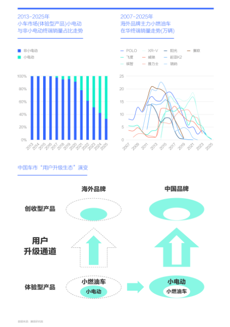 从拓展女性新赛道,到提升口碑,再到策反海外品牌的“他”,小电动除为中国品牌创造增量,还帮中国品牌重构了“用户升级生态”,并顺手瓦解了海外品牌基于小燃油车构建的“用户升级生态”。2025年底,POLO、飞度等代表性小燃油车在华销量微乎其微,接近停产状态,一个时代几乎即将画上句号;