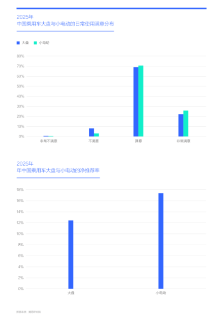 虽然中国品牌小电动仍保持着中国品牌的便宜传统,但在用料、设计、智能等方方面面,都有了大幅提升,甚至形成了优势,自然而然有利于提升用户口碑与改善品牌形象。2025年中国乘用车市场的整体满意度和非常满意度分别接近70%和超22%,小电动则分别突破70%和接近26%,都高于大盘水平。2025年中国乘用车的整体净推荐率仅12%多点,呈现下滑走势,小电动突破17%,呈现提升走势……