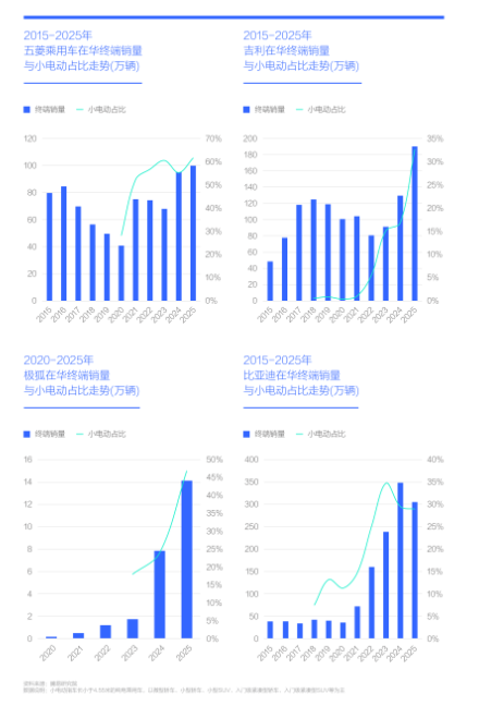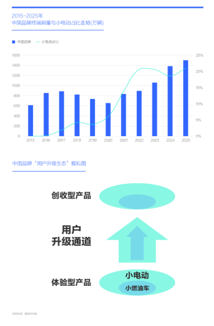 2020-2025年,在中国品牌在华终端销量由不足700万辆飙升至1500万辆,和市占率由30%多飙升至60%多的过程中,小电动不仅贡献了三分之一的销量,也间接助推了另外三分之二的增量。在前三年有疫情后三年有经济萎靡的至暗时刻,小电动助推中国品牌强势崛起并成为中国车市的新主导力量;