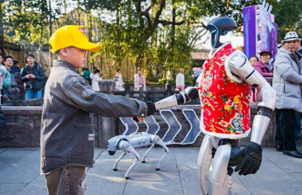 在年俗互动区,通过书法家现场挥毫营造传统年味,在“抓马趣擂台”设置“一箭中的”“赶马大赛”等五项趣味打卡挑战,游客通关赢取的“乌金币”可在“诸神福务所”及多个场地实现互动体验与消费折扣的双重价值,同时配合以机器人、机器狗贺春表演,构建起集文化体验、趣味竞技、商业互动与科技娱乐于一体的全域新春沉浸场景。