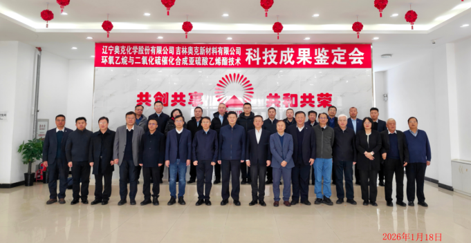 2026年1月18日上午,由辽宁奥克化学股份有限公司(以下简称“奥克股份”)和吉林奥克新材料有限公司(以下简称“吉林奥克”)联合开发完成的“环氧乙烷与二氧化硫催化合成锂电池添加剂用亚硫酸乙烯酯技术”,在吉林省吉林市顺利通过了中国石油和化学工业联合会组织的科技成果鉴定。