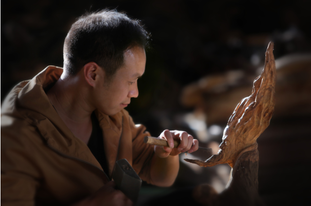 陈兴出生于福建省永泰县长庆镇的一个山村,自幼在群山林木间长大,与自然结下不解之缘。1992年,16岁的他离开家乡外出学艺,从木雕学徒做起,在实践中不断磨炼技艺。2004年,陈兴转向根雕艺术,系统研习传统工艺;2008年,他扎根云南腾冲,在林木资源丰富、文化底蕴深厚的环境中潜心创作,逐步形成“循纹而琢、顺形而创”的艺术风格。三十余年来,他始终坚持尊重自然形态,将历史文化、人文精神融入创作之中,使枯根朽木焕发出新的艺术生命。