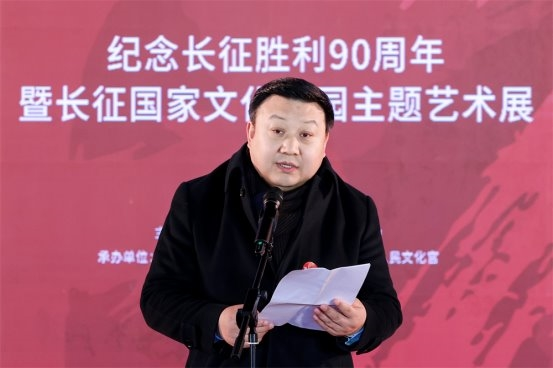 中国艺术研究院副院长徐福山主持展览开幕式开幕式上,周庆富首先致辞。他指出,90年前的长征是中国共产党人理想信念的胜利,是彪炳史册的伟大征程。为赓续红色血脉,中国艺术研究院于2025年启动“长征国家文化公园主题创作实践活动”,组织百余名艺术家重走长征路,深入生活、扎根人民,最终创作遴选近120件(组)作品,形成此次主题鲜明、艺术多元的展览。他表示,本次展览既是对革命先辈的深切缅怀,也是对长征精神的当代诠释,体现了艺术工作者“以人民为中心”的创作导向和使命担当。