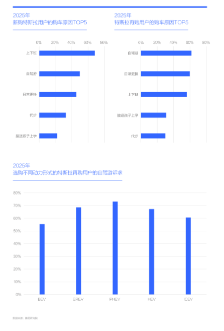 2025年,新购特斯拉用户相对年轻,集中25-40岁,在大城市,这部分用户正是“牛马”的主力。同期新购特斯拉用户的首要购车原因就是上下班,占比接近70%,第二的自驾游不足50%。特斯拉再购用户的首要购车原因则是自驾游,占比突破60%,其次是日常更换与上下班;