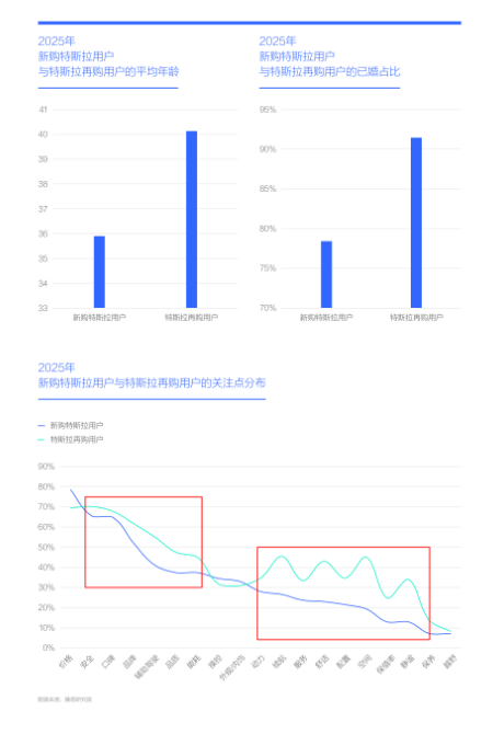 对比新购特斯拉用户,特斯拉再购用户的年龄大得多了,2025年的平均年龄突破40岁,属于典型的中年用户。特斯拉再购用户的已婚占比突破90%,且孩子普遍开始上学,不少家庭进入多孩时代,多数家庭开始承担起照顾老人的责任。特斯拉目前这批即将再购的中年用户以80后为主,他们是改革开放后看着猫和老鼠、机器猫等动画片长大的第一批小皇帝,年少时也是一批非常有激情、有活力的弄潮儿,如今摇身一变为中年大叔,大腹便便里藏着过往的无限激情,塞着当下一份份沉甸甸家庭责任,自然需要辆家庭大车为其分担解忧;
