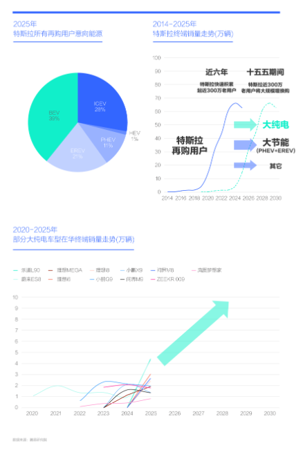 2025年,虽然问界、理想、腾势等主打增程、插混等大节能品牌,率先受益特斯拉再购用户,但之前仅涌现少部分特斯拉再购用户,且其它能源形式的产品尚未大规模布局,所以暂不能得出节能车最适合特斯拉再购用户的观点,保不齐半路就会杀出一个程咬金,尤其是大纯电产品。2025年特斯拉再购用户意向选购纯电的占比逼近40%(不等于大纯电,含小电动);