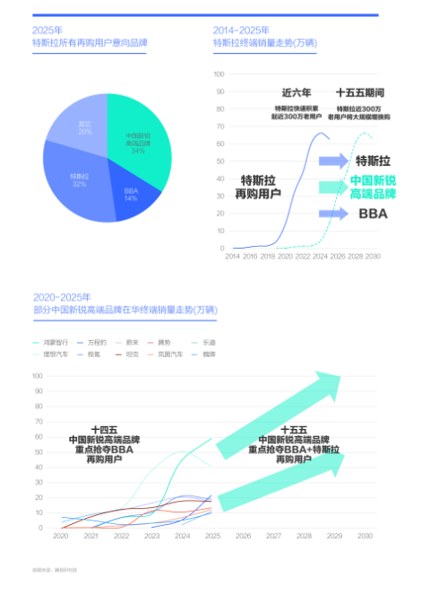 综合看,中国新锐高端品牌吸引特斯拉再购用户更有潜力,意味着在十四五时期,全心全意研究如何吸引BBA再购用户的问界、理想、蔚来等多数中国新锐高端品牌,进入十五五后,还得争分夺秒研究如何吸引特斯拉的再购用户。十五五期间,中国新锐高端品牌通过积极抢夺BBA、特斯拉等的优质老用户,争取能构建起年销量百万辆的第一阵营,和年销量50万辆的第二阵营。