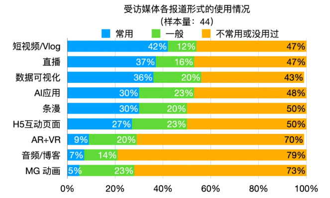 除文字报道外,短视频/Vlog、直播和数据可视化常被受访媒体使用,常用的受访媒体占比分别为42%、37%和36%。