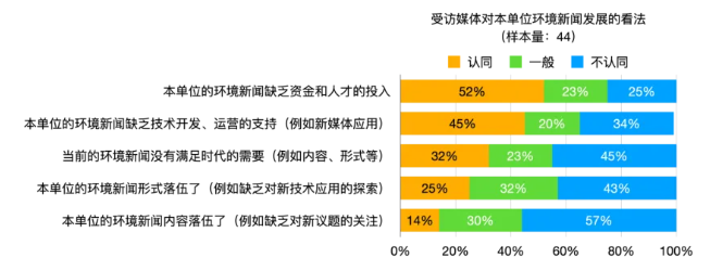 52%的受访媒体表示认同“本单位的环境新闻缺乏资金和人才的投入”,45%的受访媒体表示认同“本单位的环境新闻缺乏技术开发、运营的支持”,均高于“不认同”的比例。