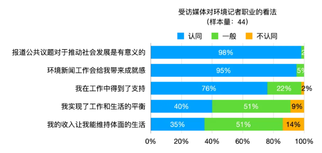 一方面,98%的受访媒体表示“报道公共议题对于推动社会发展是有意义的”,95%的受访媒体表示“环境新闻工作会给我带来成就感”,76%的受访媒体表示“在工作中得到了支持”。