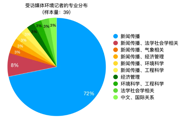 专业角度,28家媒体的环境记者最终专业只有新闻传播,占比72%;7家媒体的环境记者最终专业既包括新闻传播专业,也包括法学社会学相关、气象相关、工程科学、环境科学、经济管理,占比20%;4家媒体的环境记者最终专业没有新闻传播,主要是经济管理、环境科学、工程科学,占比12%(注:统计数据四舍五入后可能导致总占比不等于100%的情况)。