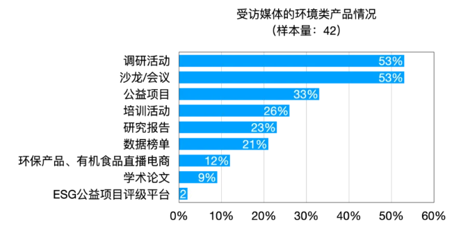 受访媒体中95%拥有环境类产品。在各种环境类产品中,53%的受访媒体曾开展调研活动,53%的受访媒体曾主办沙龙/会议,33%的受访媒体曾设置公益项目。还有受访媒体曾举办培训活动、发布研究报告、发表学术论文、搭建ESG公益项目评级平台、开展直播等。