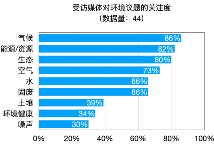 具体而言,气候、能源/资源、生态三大议题媒体关注度最高。有86%的受访媒体关注气候议题,82%的受访媒体关注能源/资源议题,80%的受访媒体关注生态议题。