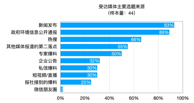 93%的受访媒体环境新闻选题主要来源是“新闻发布”,有89%的受访媒体主要选题来源是“政府环境信息公开通报”,有66%的受访媒体主要选题来源是“热搜”,有55%的受访媒体主要选题来源是“其他媒体报道的第二落点”。