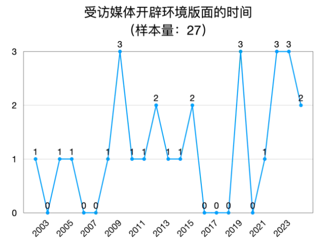 从时间段看,受访媒体中开设环境版面的时间集中在2009年前后、2019—2023年。前者关联哥本哈根气候谈判、雾霾突袭等,后者与打赢污染防治攻坚战、提出“双碳”目标等有关。
