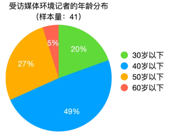 受访媒体中,8家媒体环境记者年龄集中在30岁以下,占比20%;20家媒体环境记者年龄集中在40岁以下,占比49%;11家媒体环境记者年龄集中在50岁以下,占比27%;还有2家媒体环境记者的年龄分布较高,最高到60岁,占比5%。