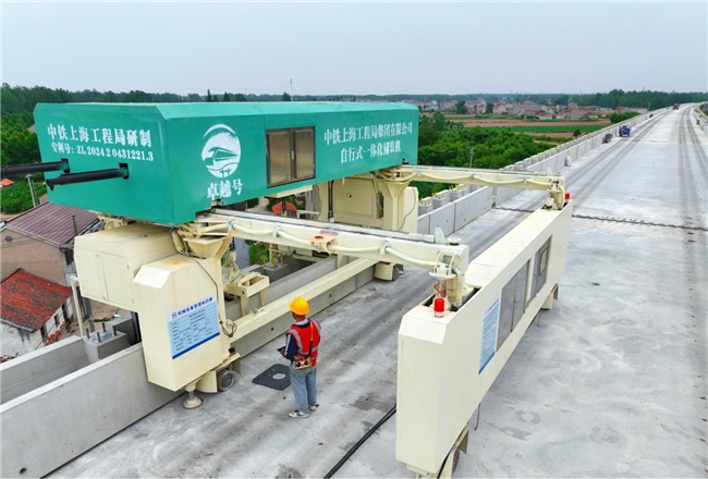 自项目启动以来,建设管理单位沪杭客专公司协同施工单位中铁上海局项目部依托劳模创新工作室,组建智能建造科技团队,持续优化施工方案与工艺装备,把装配式桥面系在工厂内预制为整体构件,成功实现从传统现浇模式向智能化预制生产的转型。整个预制过程实现一键启动、自动化流水作业,依托互联网系统对各个工序实时监测与协调,10道主要工序高效衔接,单块构件生产仅需10分钟。