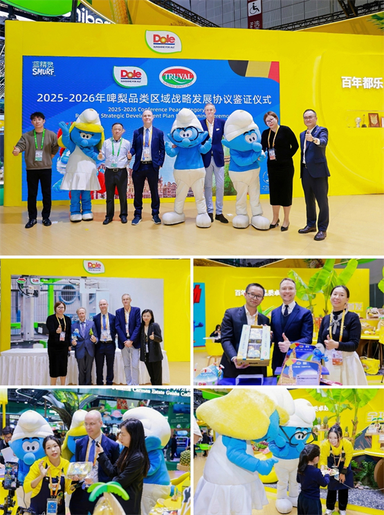 焦点之一是与比利时水果山谷协会及国内头部渠道商百果园、比优特共同举办的2025-2026年啤梨品类区域战略发展协议签订仪式。比利时 啤梨 即将迎来进入中国市场的第十五年。脆软 两吃 、细核肉厚,可食率极高,果皮上有着自然的小雀斑,更是天然生长的有力证明。自2011年由都乐率先引进中国以来,都乐与比利时水果山谷协会携手,推动它从“小众精品”走向大众视野。啤梨作为风靡欧洲的明星水果,在比利时的自然培育种植有着超过100年的经验积累,曾在2019年入选比利时公主率领的访华经贸团伴手礼。2024年,都乐与比利时水果山谷协会曾在进博会上联合发布国内首款蓝精灵IP联名款Truval啤梨礼盒,当比利时国宝梨遇上比利时国宝IP,提升产品活力,增强情感联结。随着今年MOU的签订,各方将继续协同投入资源,借助IP影响力深化市场培育,共同打造爆款活动,实现品牌声量与销售业绩的双重提升。