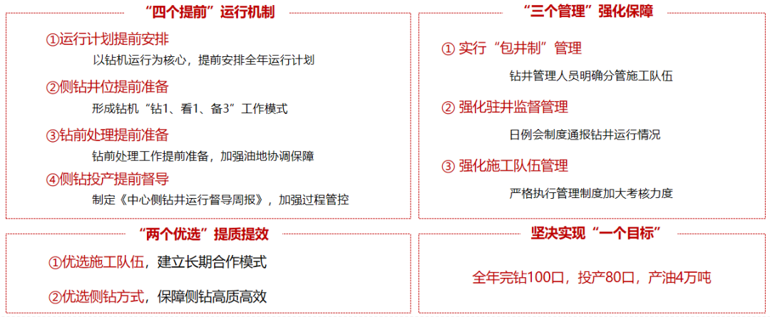 侧钻井项目组以“组织保障、运行提效、施工提速、监督提质”为目标,明确职责,压实责任;将运行流程分解为8个节点,按照关键因素分为4个核心节点、4个辅助节点,改变原首尾相接的递进式运行模式,优化形成多节点一体运行的“4321” 管理运行模式。通过“四个提前”机制、“三个管理”保障、“两个优选”提效,实现“一个目标”,确保各节点运行无缝衔接。