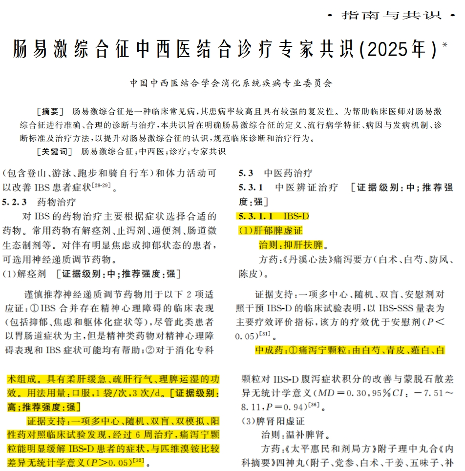 近日,中国中西医结合学会消化系统疾病专业委员会正式发布《肠易激综合征中西医结合诊疗专家共识(2025)》,其中再度推荐华森制药的痛泻宁颗粒用于临床治疗。值得一提的是,IBS-D肝郁脾虚证,治则应抑肝扶脾。痛泻宁颗粒作为唯一具有高级别循证医学证据、强推荐的中成药,其证据支持源于一项高质量大样本多中心RCT研究,效果显著。
