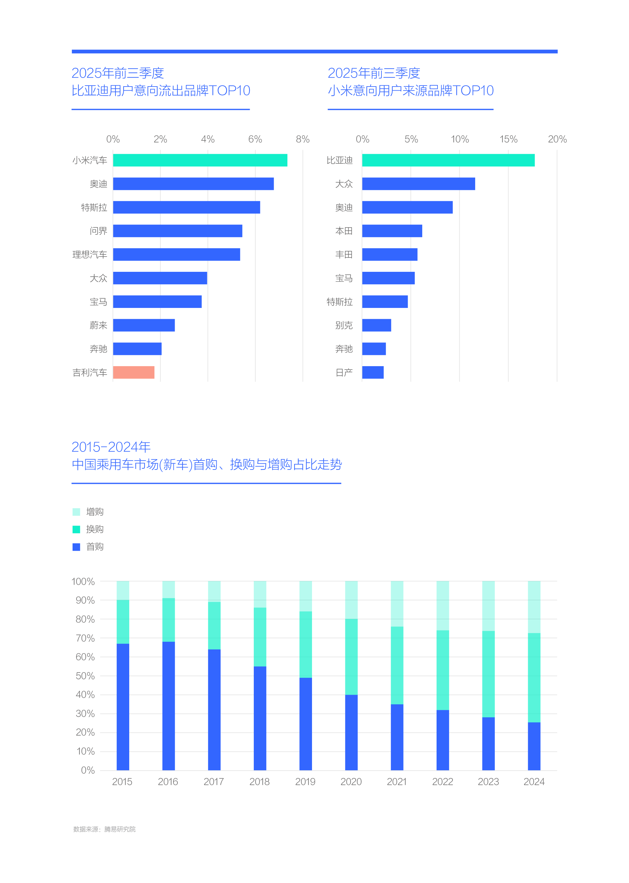 比亚迪辛辛苦苦推动了中国新能源产品消费的普及,一旦自己留不住老用户,过去的努力付出约等于给小米、问界、理想等新锐高端新能源品牌做嫁衣。从小米汽车的意向用户来源看,2025年比亚迪已经成为小米汽车的最大粮仓,贡献了近18%的存量用户。虽然2025年小米汽车深陷碰撞事件、过度营销等舆论漩涡,但并没有改变小米汽车存量用户主要来自比亚迪的结果;