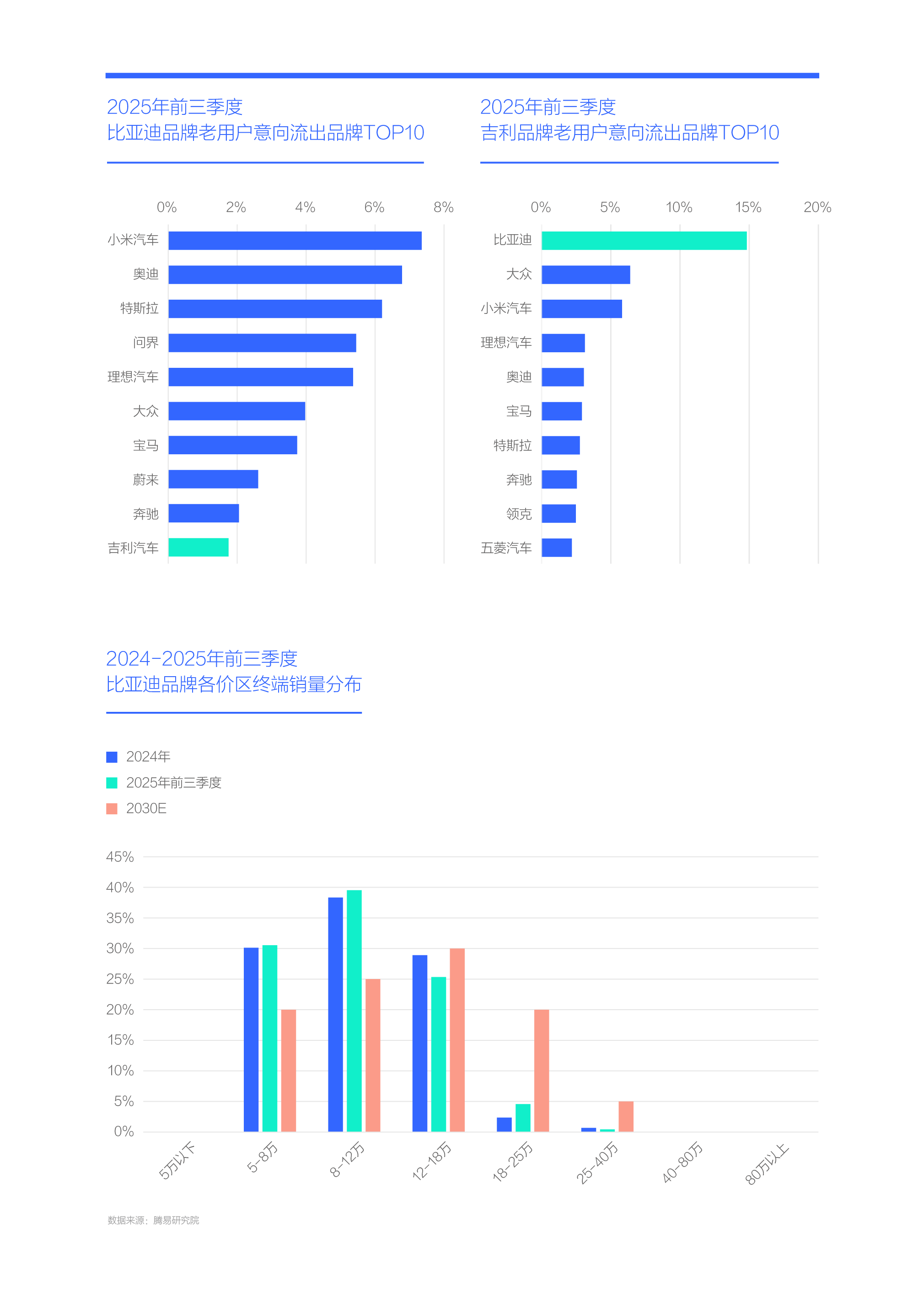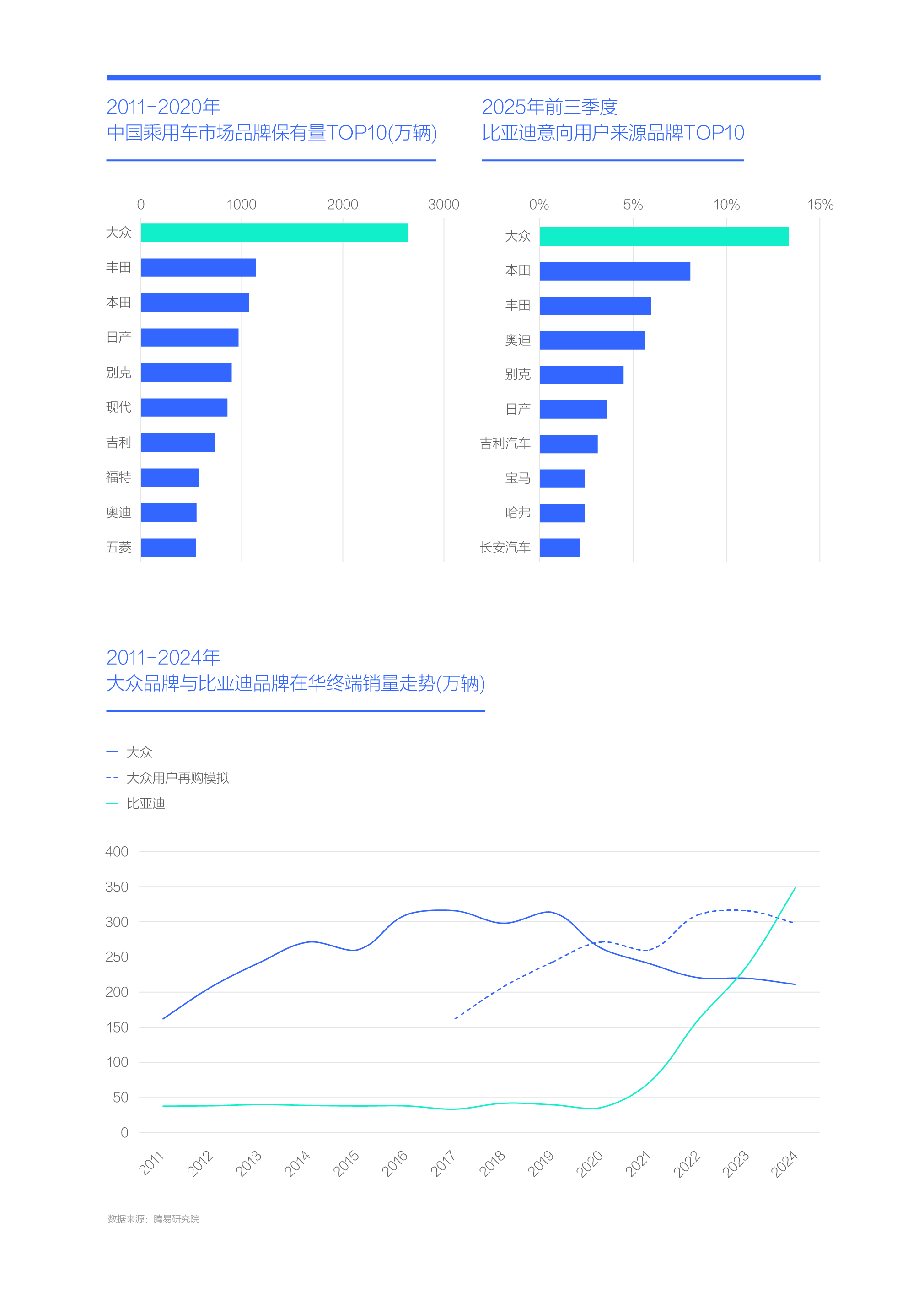 2021-2024年,比亚迪之所以能实现对大众汽车的绝地反击,除了秦PLUS、宋PLUS、唐、汉等正面挤压宝来、速腾、朗逸、迈腾、帕萨特等大众同级别车型的市场空间,还与比亚迪在大众后院开辟第二战场密切相关。基于代步小电动、超级性价比型节能技术DM-i等,比亚迪掀起了快速抢夺大众老用户的全新竞争模式。2025年前三季度,大众仍是比亚迪意向用户来源的最大贡献者,占比超过13%。丰田、本田、日产之日系三剑客也为比亚迪贡献了大量存量用户;