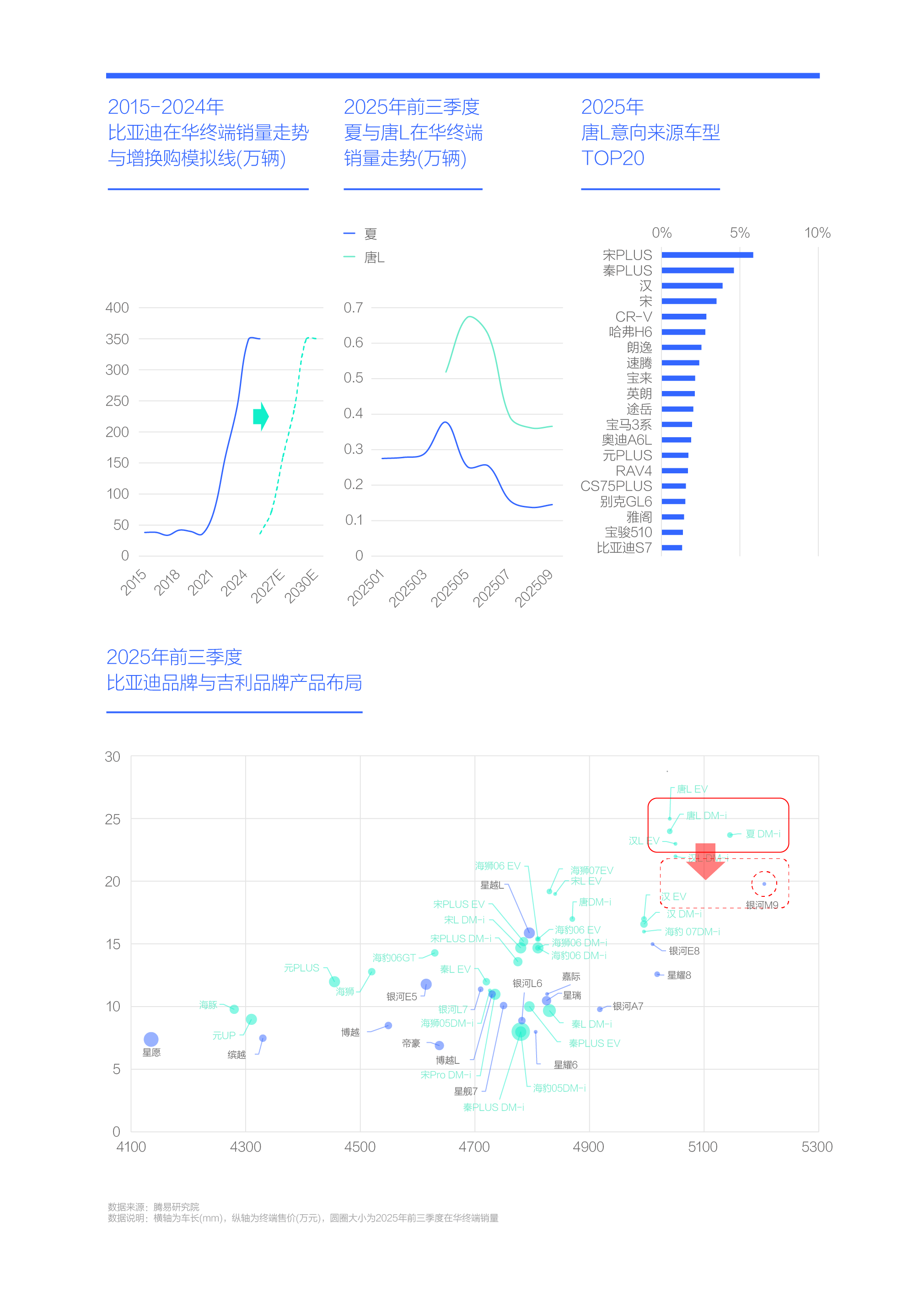 比亚迪本轮的强势崛起始于2021年,且在早期使用年限只有6年的网约车的占比并不低,理论上从2026年起比亚迪的老用户就会开始大规模增换购。调研显示,2025年多数比亚迪的换购用户偏好4.8米及以上(中型及以上)大节能车,比亚迪自己也心知肚明,为了更好留住自身用户,比亚迪于2025年初先后投放了中大型MPV夏和中大型SUV唐L两款高端产品,积极试水存量车市;