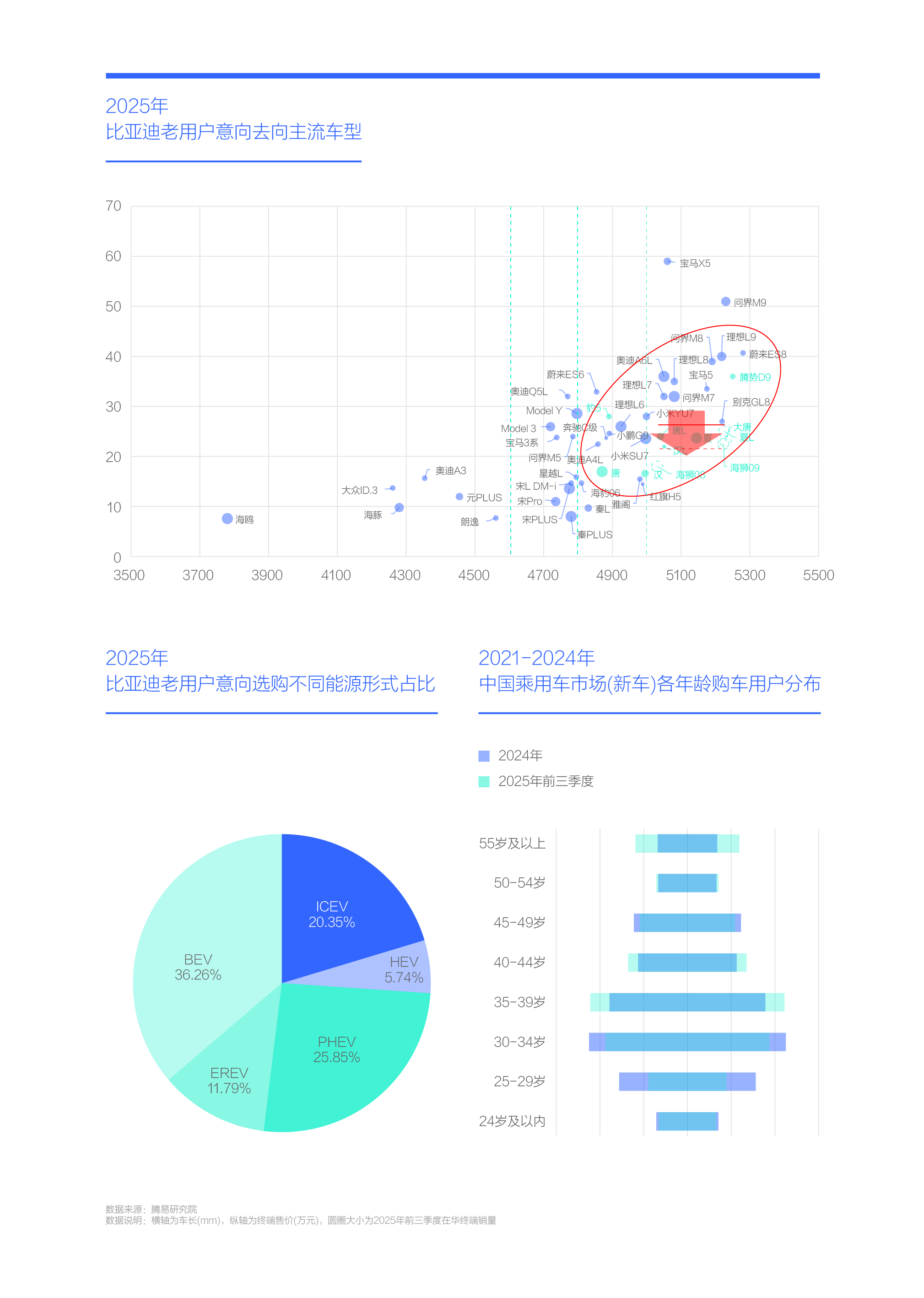 目前,比亚迪与中国车市大盘购车用户的平均年龄都突破了40周岁,再购诉求凸显高端化与大车化,意向车型尺寸集中4.8米及以上的中型、中大型和大型,意向品类集中更适合家庭的SUV与MPV。十五五期间,比亚迪与中国车市大盘用户的平均购车年龄,将由40周岁向45周岁逼近,三代同堂式的高端化、大车化、节能化等趋势会更加凸显。期间,如比亚迪不强化高端攻势,当比亚迪老用户开始大规模增换购时,新锐高端新能源品牌等将迎来更好发展环境;