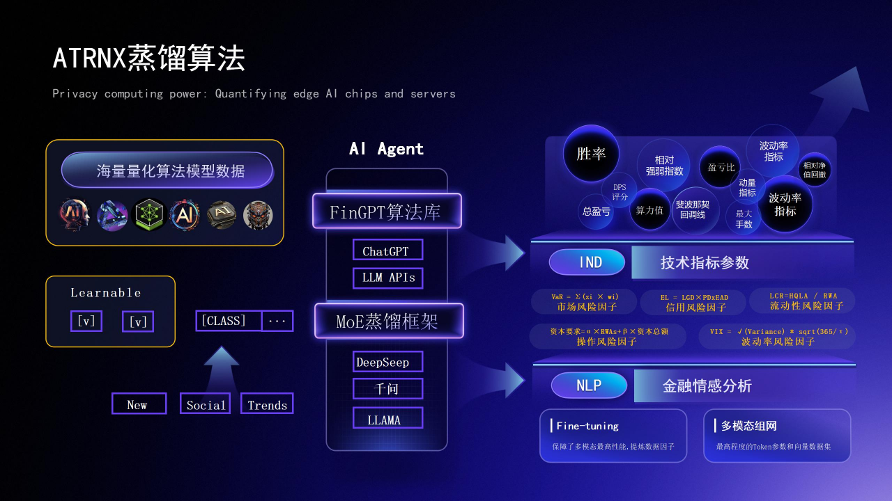 ATRNX项目的核心技术突破在于构建了全栈式自主技术生态。其基于AlphaGo原理的蒸馏算法架构,通过集成多种大模型,构建了可动态组网的"算法电网",实现了对宏观政策与市场情绪的智能分析。