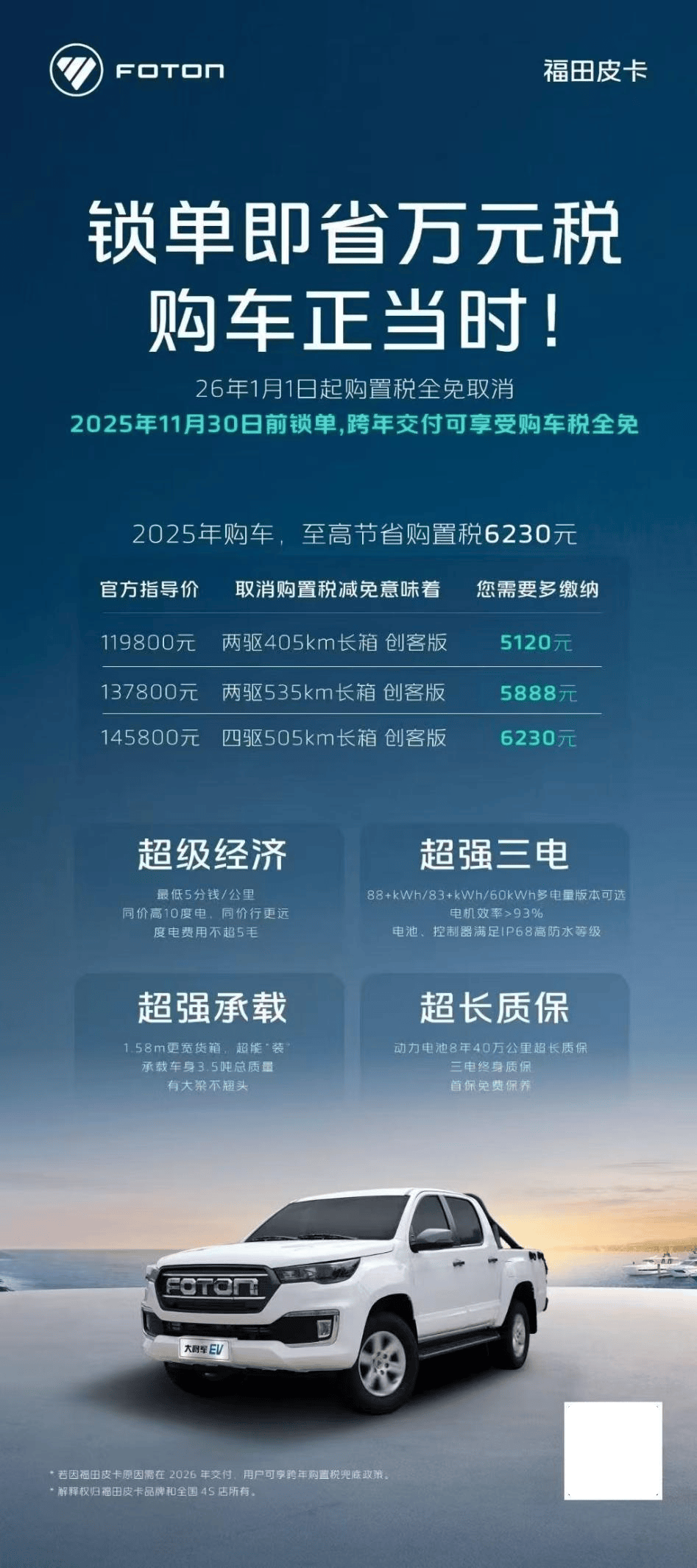 在创富路上,每一分钱都应花在刀刃上。2025年内购大将军EV创客版,享受购置税全免,至高节省购置税6230元。福田皮卡重磅推出[安心购]方案,2025年11月30日前锁单,车辆因福田皮卡原因需跨年至2026年交付,用户仍可享受购置税全免政策。这一购置政策不仅是一笔费用的节省,更是大将军EV创客版与用户并肩前行,将更多资源投入于业务拓展的诚意体现。