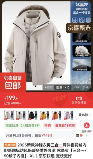 京喜自营甄选的2025款三合一冲锋衣,凭借“防风、防水、防污”核心功能,以及可拆卸防风帽、魔术贴袖口等实用设计,适配户外登山、旅游徒步等多场景需求,赢得了消费者的广泛认可。在京喜自营提供的运营、物流、售后全链路支持下,该产品在功能性服饰细分市场展现出强劲增长势头,彰显出京喜自营对优质功能型产品的孵化与推广实力。