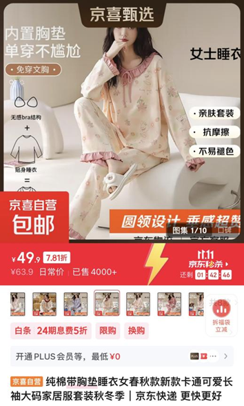 广东潮汕产业带的带胸垫纯棉睡衣套装同样热销。京东11.11期间,该单品上线单日即实现三千单的销量,远超以往销售纪录。这一成绩也再次印证了京喜自营始终围绕“质价比”核心,精准满足了消费者对实惠与品质的双重需求。