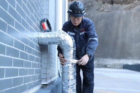 11月29日,山东能源西北矿业望田煤业机电管理部技术员何俊源俯身贴近井口供暖管路,核对温度表上的数据,并在冬季“三防”日志表上记录着供暖运行情况。