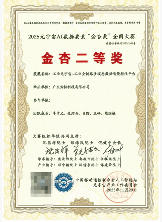 广东方柚科技有限公司 《工业元宇宙——工业全链路多模态数据智能标注平台》,从全国289个申报项目中脱颖而出,荣获本次大赛“二等奖”,成为数据要素与工业元宇宙融合领域的标杆案例。该方案集成多先进模型,分层架构处理多模态数据,预标注准确率 95%+,效率较人工升 8-10 倍、成本降 60%。平台构建的 “多源汇聚 - 深度标注 - 价值释放” 全链路数据要素应用模式,已在化工、石油、矿山、电力、智能制造等多行业落地实践,助力工业数据要素价值释放。