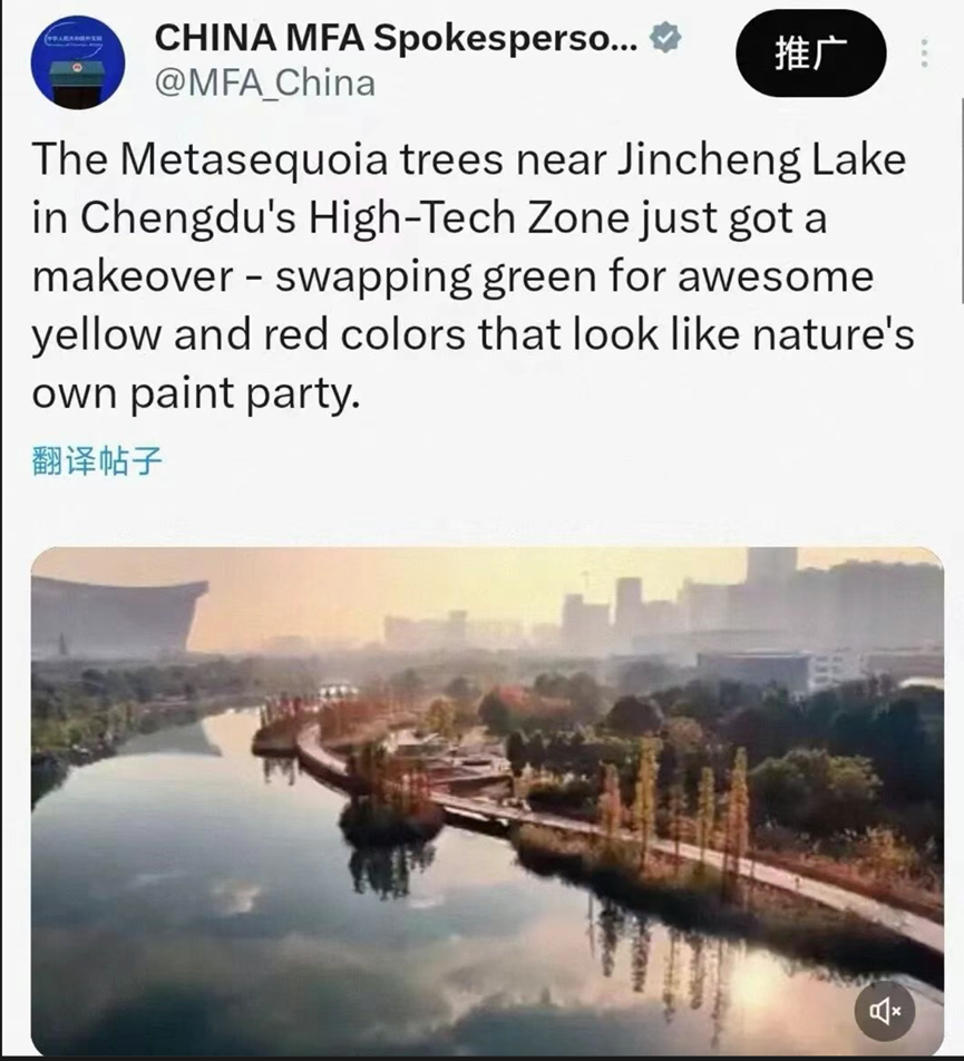 中国外交部发言人海外社交媒体账号用视频生动展示了成都高新区锦城湖的杉林由绿、黄变为不同的红色,多彩颜色相互渲染、映衬,一幅动人的画卷展现在大家眼前。