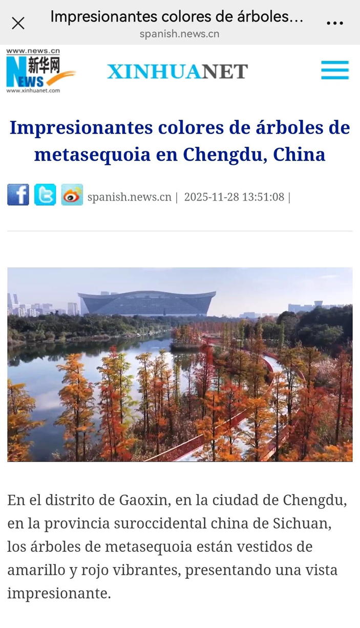这一次,中国外交部发言人向全球朋友展示了成都高新区锦城湖的那抹冬季限定美景——红了的落羽红杉、池杉。