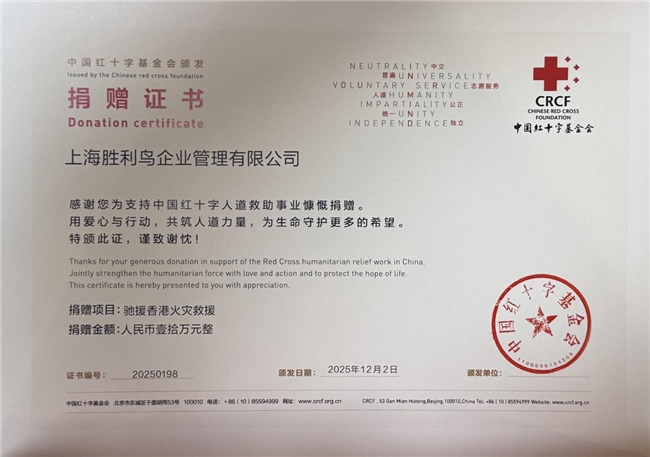 上海胜利鸟企业管理有限公司(简称:胜利鸟战略咨询)无私付出,通过北京红十字会向香港捐赠10万元,为受灾家庭和个人提供经济援助。