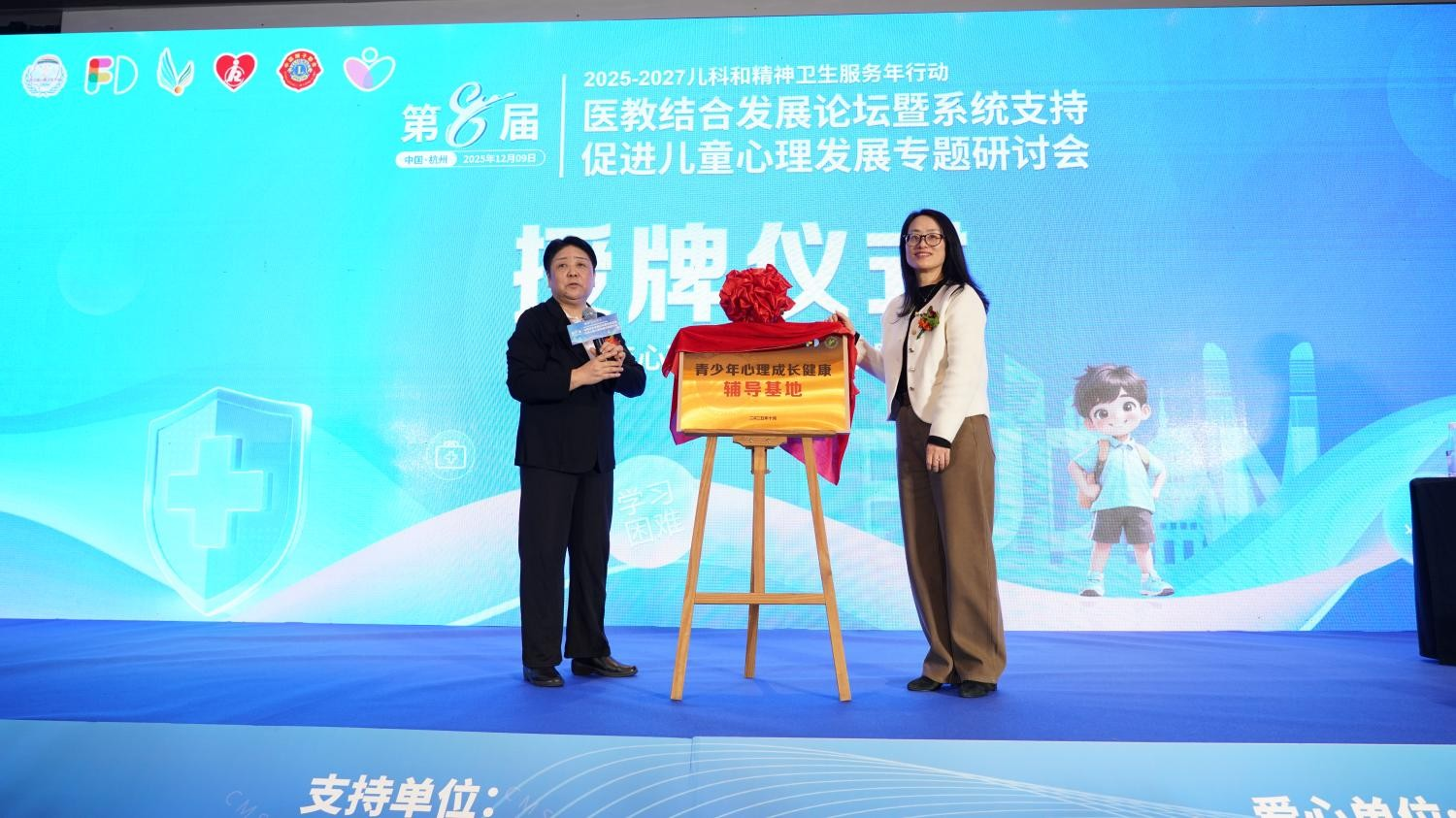 论坛期间举行了重要的授牌仪式,杭州复旦儿童医院与杭州市青春中学分别被授予“青少年心理成长健康辅导基地”与“家校医心理融合研究基地”称号。医院执行院长朱晓华与校方代表蒋彤副校长共同完成授牌,标志着区域“医教家”协同模式进入机制化建设新阶段,为儿童心理健康支持网络的持续发展提供了重要平台。