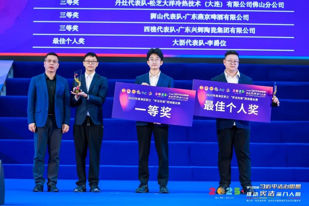 活动上,2025年南海区职工“学法先锋”现场擂台赛(决赛)火热开赛,来自全区7个镇(街道)的企业代表队同台竞技,角逐“学法冠军”。比赛设置了必答题、个人赛、风险题、抢答题四大环节,竞赛内容既包含党的二十大精神、党史知识等,又聚焦与职工工作生活息息相关的民法典、工会法、劳动合同法等多个法律领域,全面考察选手的法律素养与现场应变能力。