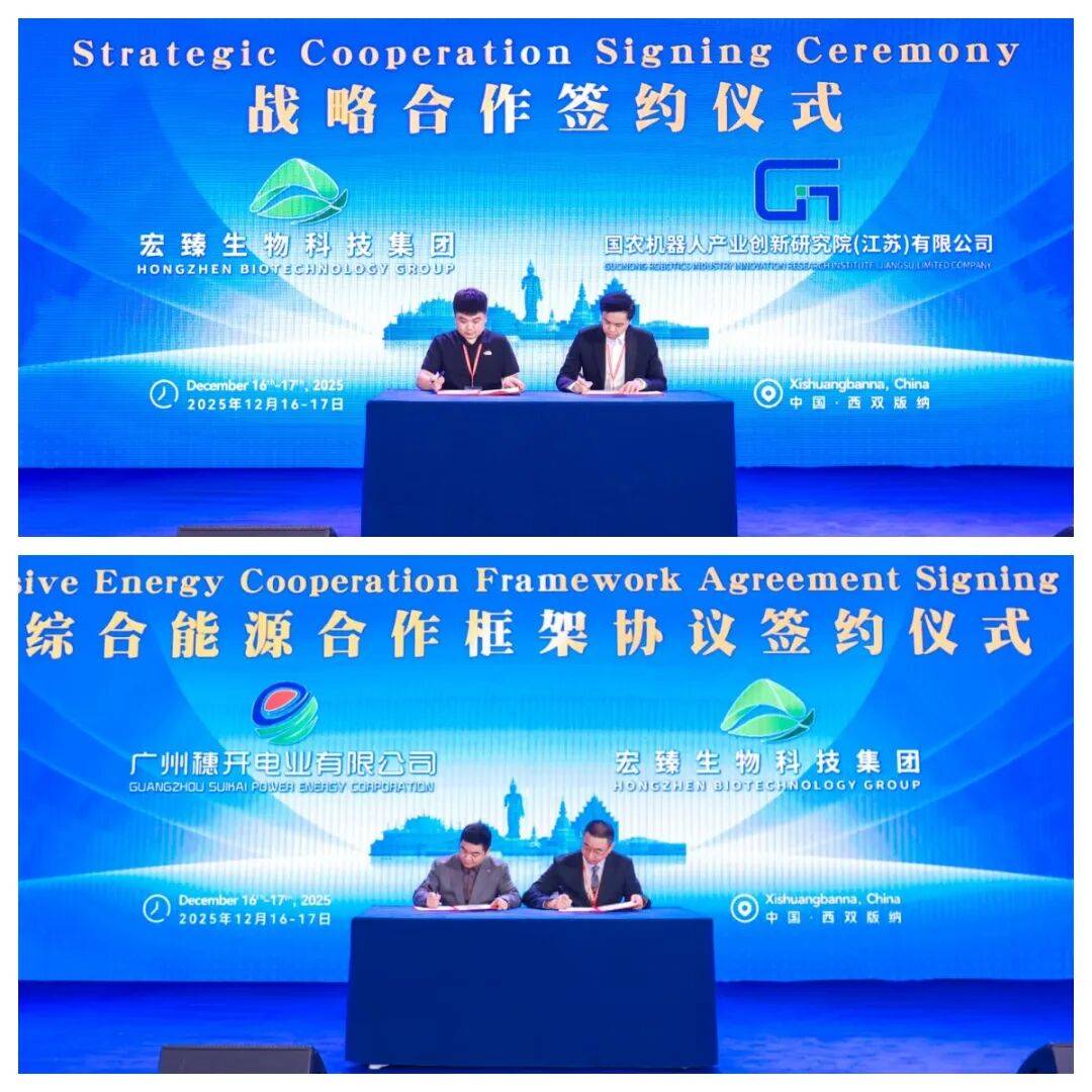 在2025国际黑牛肝菌技术创新大会的“协同创新,合作共赢”重点合作项目签约仪式环节,宏臻生物与国农机器人达成战略合作。广州穗开电业有限公司与贵州宏臻菌业投资发展有限公司签订综合能源合作框架协议。