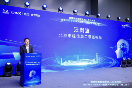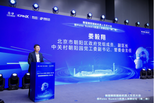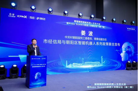 政策赋能:智能机器人系列支持政策发布 大会现场,北京市经信局二级巡视员汪剑波;朝阳区政府党组成员、副区长,中关村朝阳园党工委副书记、管委会主任娄毅翔出席并致辞。