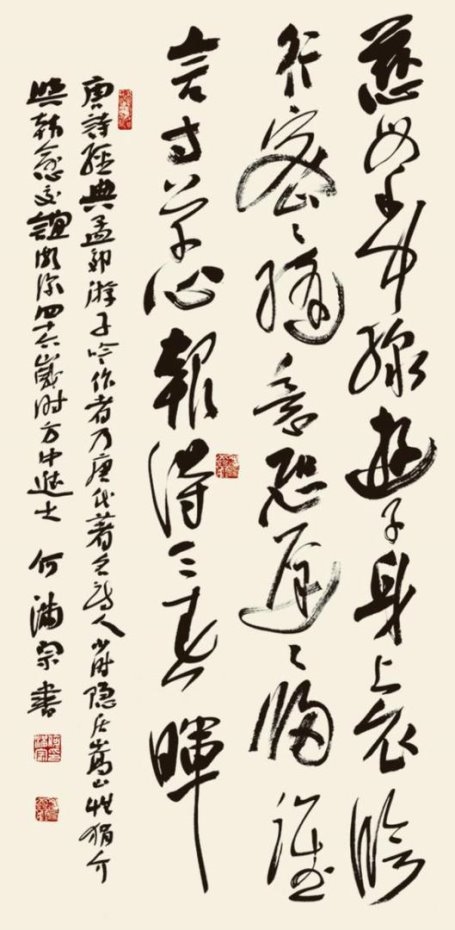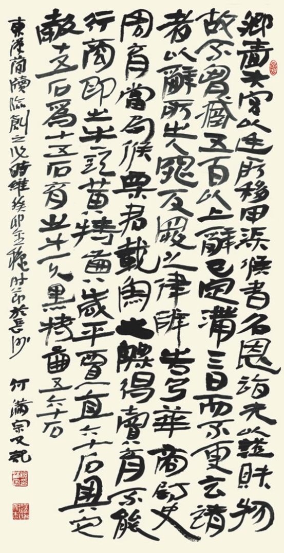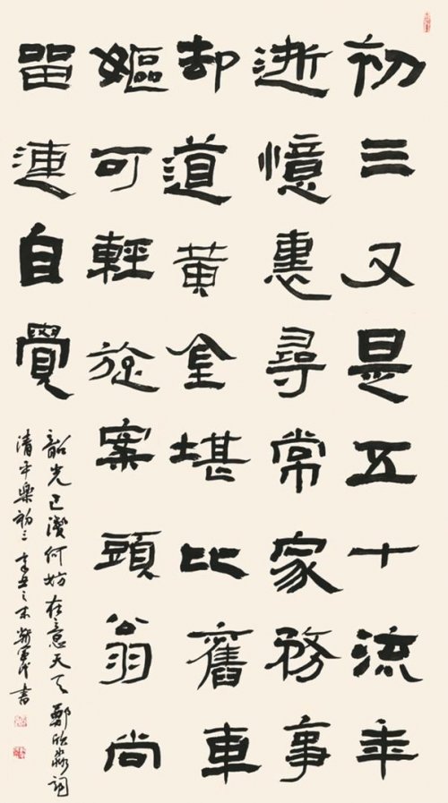 立斌在书法临摹与创作上功力殊深,他没有走“展览体”的功名之路,绝不走偏道,不走“捷径”,而是按照文化书法美学要求坚持走守正创新之路,以实事求是、务实求实的态度,每天日课从历代书法经典中汲取更多的营养。坚持“⽂化书法”的大⽂化属性,在勤奋严谨的基础上,在传统的根基上求实创新,其作品令人眼前一亮。