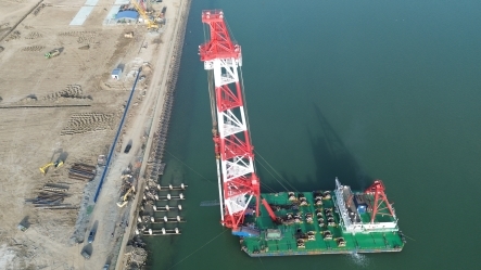 中交一航局第一工程有限公司承建的黄骅港综合港区10万吨级通用泊位工程将建设2个10万吨级通用散杂货泊位,在筹备初期,项目部便面临施工海域受限、工期紧张等多重挑战,后承台基础施工更是制约项目进度的“硬骨头”。在工程设计之初,考虑到项目与相邻的冀海码头施工现场距离较近,为避免施工中出现碰桩风险,相接处桩基设计方案为部分灌注桩施工工艺。