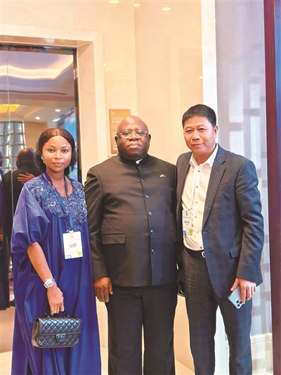 陈国锋(右)赴塞拉利昂考察时,与塞拉利昂国家投资委员会主席法蒂玛·马哈瓦·桑迪(左)、塞拉利昂驻华大使阿布·巴卡尔·卡里姆(中)合影