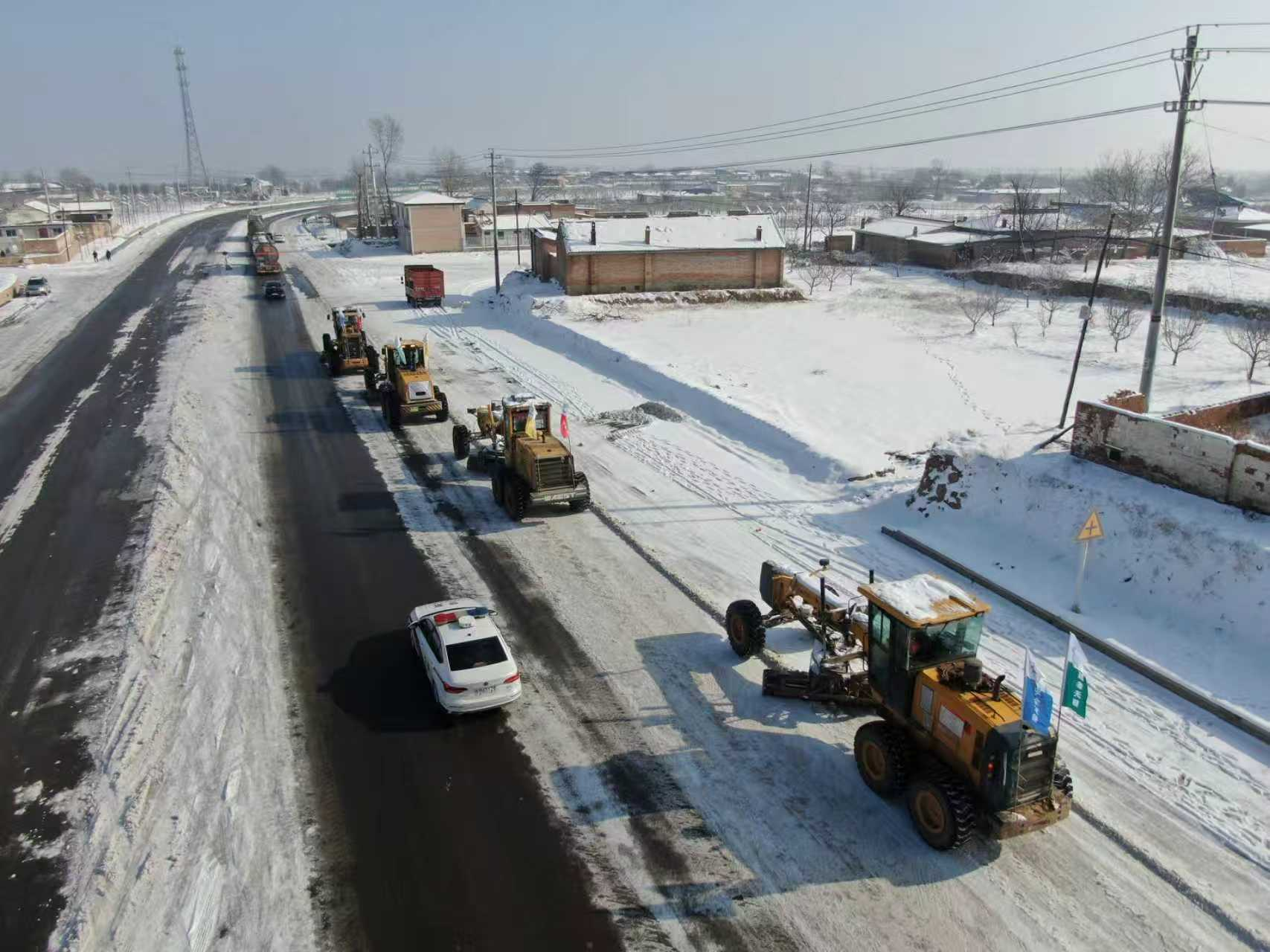 项目团队深知,道路就是群众的“生命线”,保畅通就是保民生。在零下10摄氏度的严寒中,5台平地机破冰清雪,秩序井然,轻卡车上工作人员精准撒布融雪盐;在地方政府与交通部门的协作下,项目团队全程盯控除雪作业,并引导来往车辆有序、安全通行。