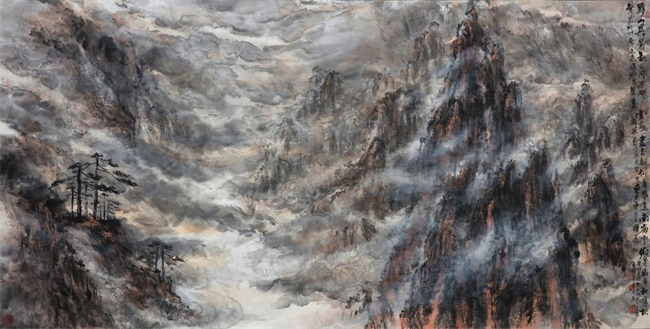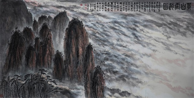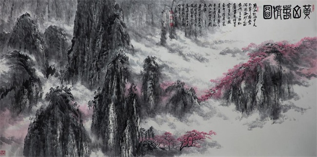 而在创作山水画时,王锁平则更多地表达了对大自然的敬畏和对宁静、悠远意境的追求。他多次前往黄山,在山间感受云雾的变幻和松树的坚韧。其作品《黄山松云图》意境空灵悠远:笔墨上以淡墨为主,借墨色浓淡与线条疏密,绘出山峦朦胧、云雾缥缈之态;线条简洁流畅且富韵律,勾勒出奇峰险峻、松树挺拔之姿。构图采用高远法,引观者视线至远方峰雾,予人无限遐想。画面中峰立雾绕似仙境,松树添生机,既象征坚韧品格,又传递出自然的静谧之美。他将自身情感与自然景观融为一体,通过笔墨将这份宁静与悠远精准传递给观者。